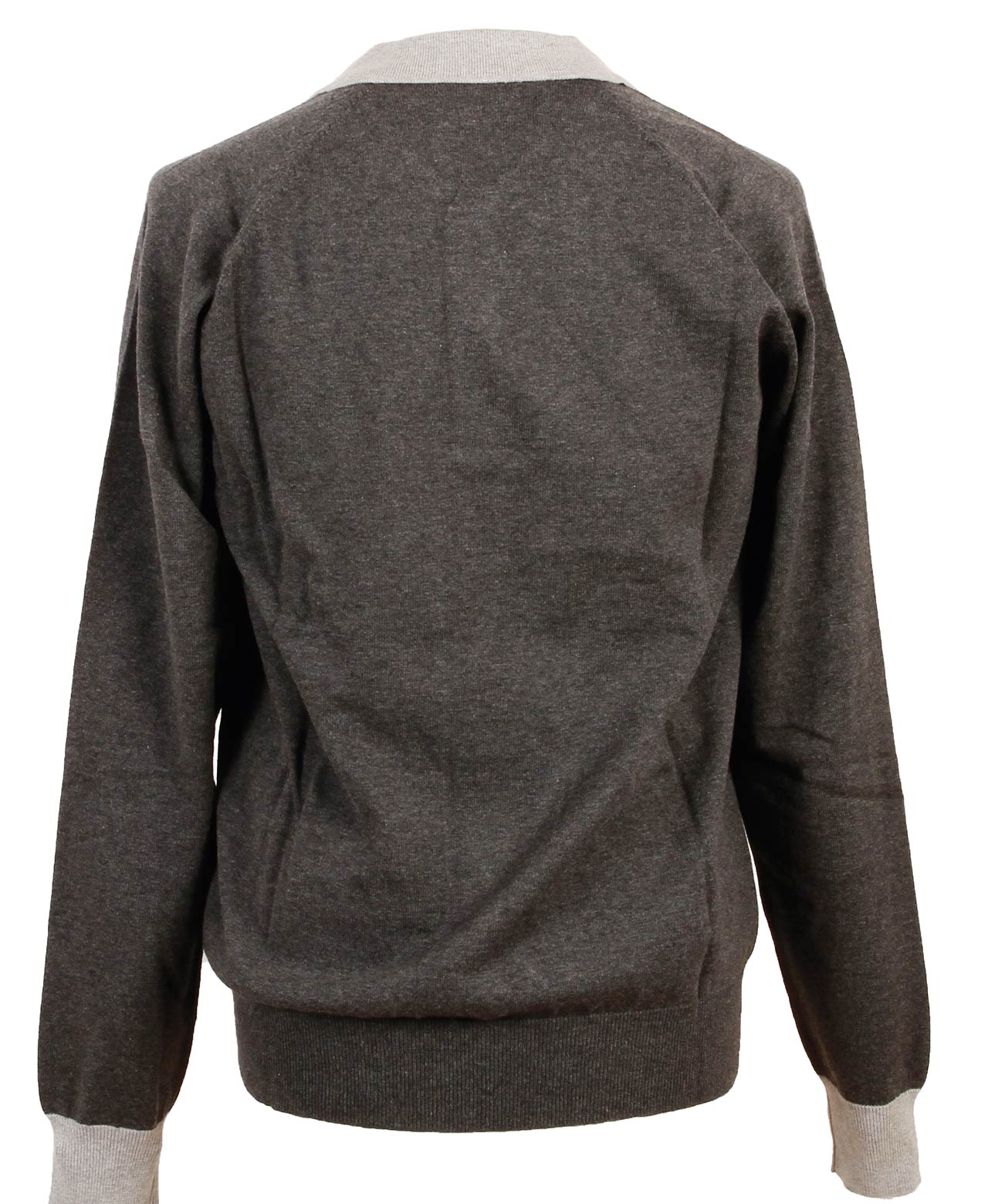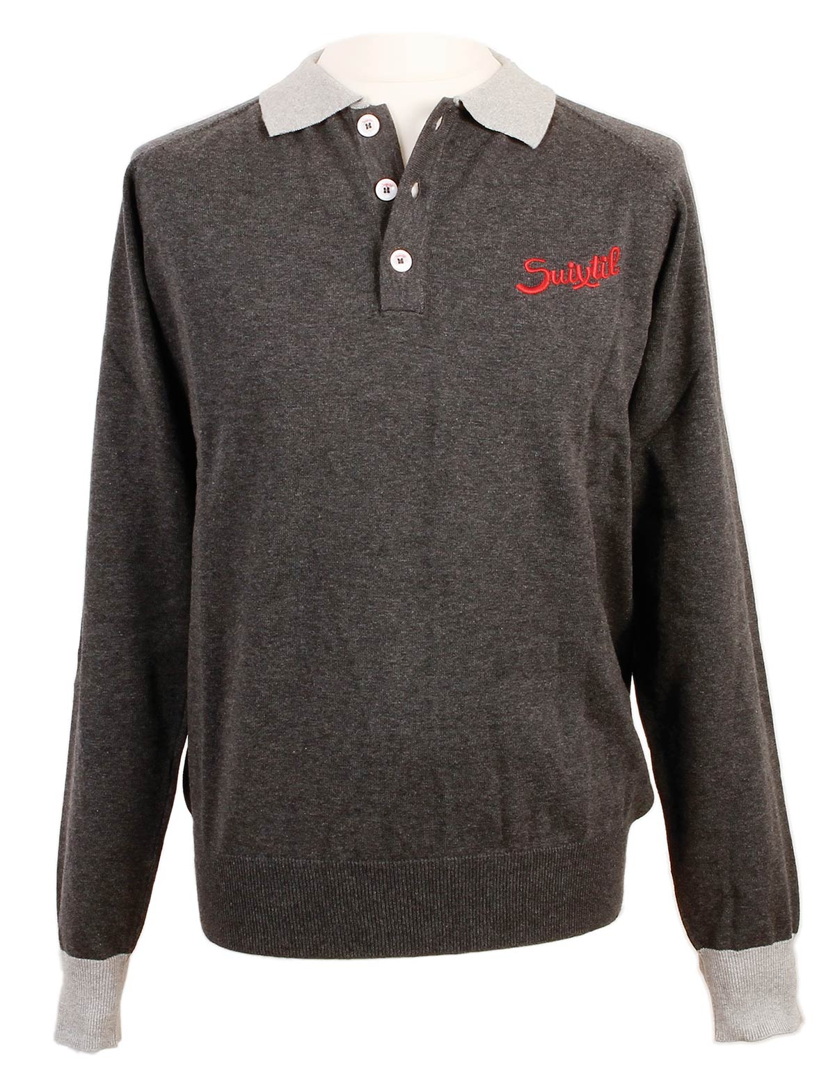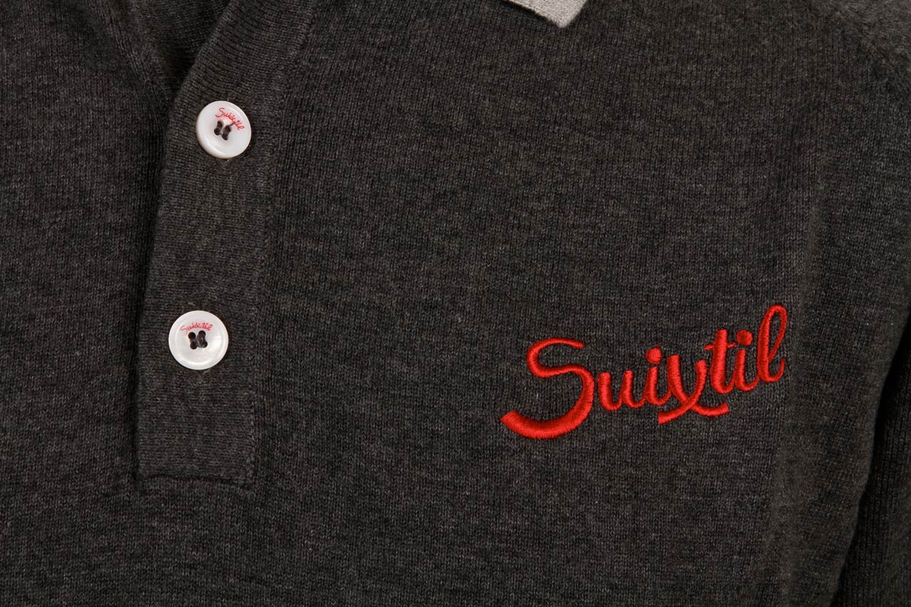 With raglan sleeves and red Suixtil logo embroidery engraved and real shell buttons, a classic two-tone design of a sweater